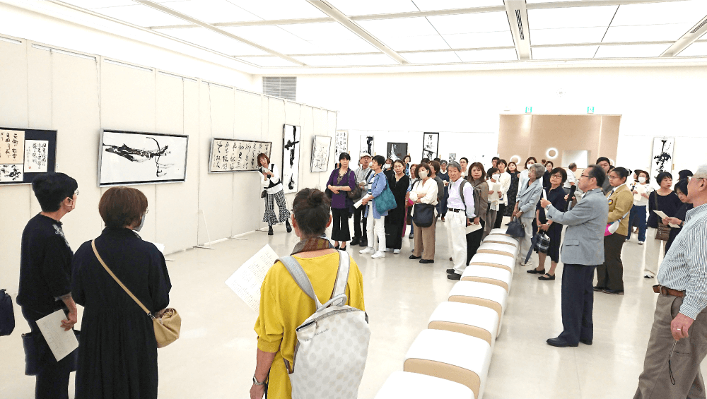 講師は島田啓敬理事長。名誉会長、会長、理事長等の作品をもとに前衛書の表現意図や技法、用具等を具体的に説明。約70名の参加者から「新しい表現の世界を知った」という感想も寄せられた。